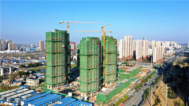 日前,記者在合肥高新區永和家園北組團安置房項目建設現場見到6棟住宅樓拔地而起、排列整齊,建築工人分散在樓棟內各處砌牆、抹灰、運料,有序忙碌着。