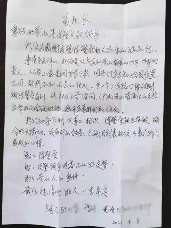 4月9日,安徽黃山風景區交警支隊收到一份來自遊客的感謝信,大連遊客對景區交警貼心幫助表示誠摯的謝意。