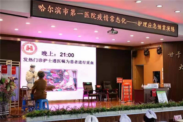 4月8日,哈爾濱市第一醫院疫情防控常態化護理應急預案演練在哈爾濱市第一醫院多功能廳舉行。本次演練由護理部和感染科聯合組織,以事件背景和場景現場模擬推演為主要形式,10餘個臨床科室護理人員參與此次應急預案演練演示。哈爾濱市第一醫院副院長吳麗潔、感染科科長王麗萍、護理部負責人李艷奇及全院百餘名護理人員共同觀摩演練。