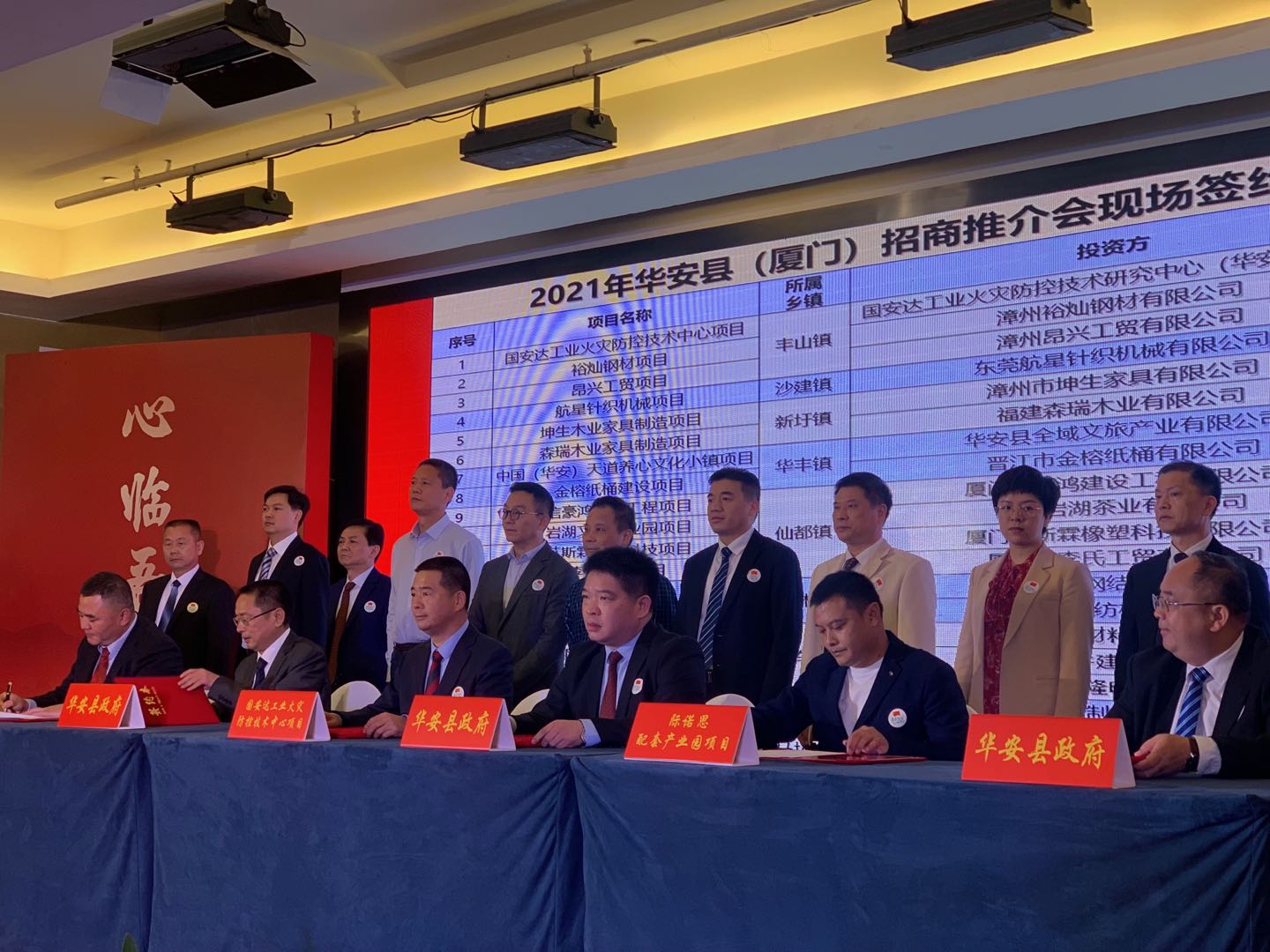 活動現場還舉行了項目簽約儀式,國安達工業火災防控技術中心、中國(華安)天道養心文化小鎮、際諾思配套產業園等21個招商引資項目順利簽約,總投資49億元,涉及工業、文旅等領域。據了解,這兩年,華安縣依託各異地商會,聘請招商顧問,組建處級領導招商小分隊,實施「一把手招商」「以商引商」「精準招商」,聚焦廈門、上海、深圳等地「退二進三」產業,立足「招大商」,開展「大招商」,共對接引進項目66個,計劃總投資219.25億元。