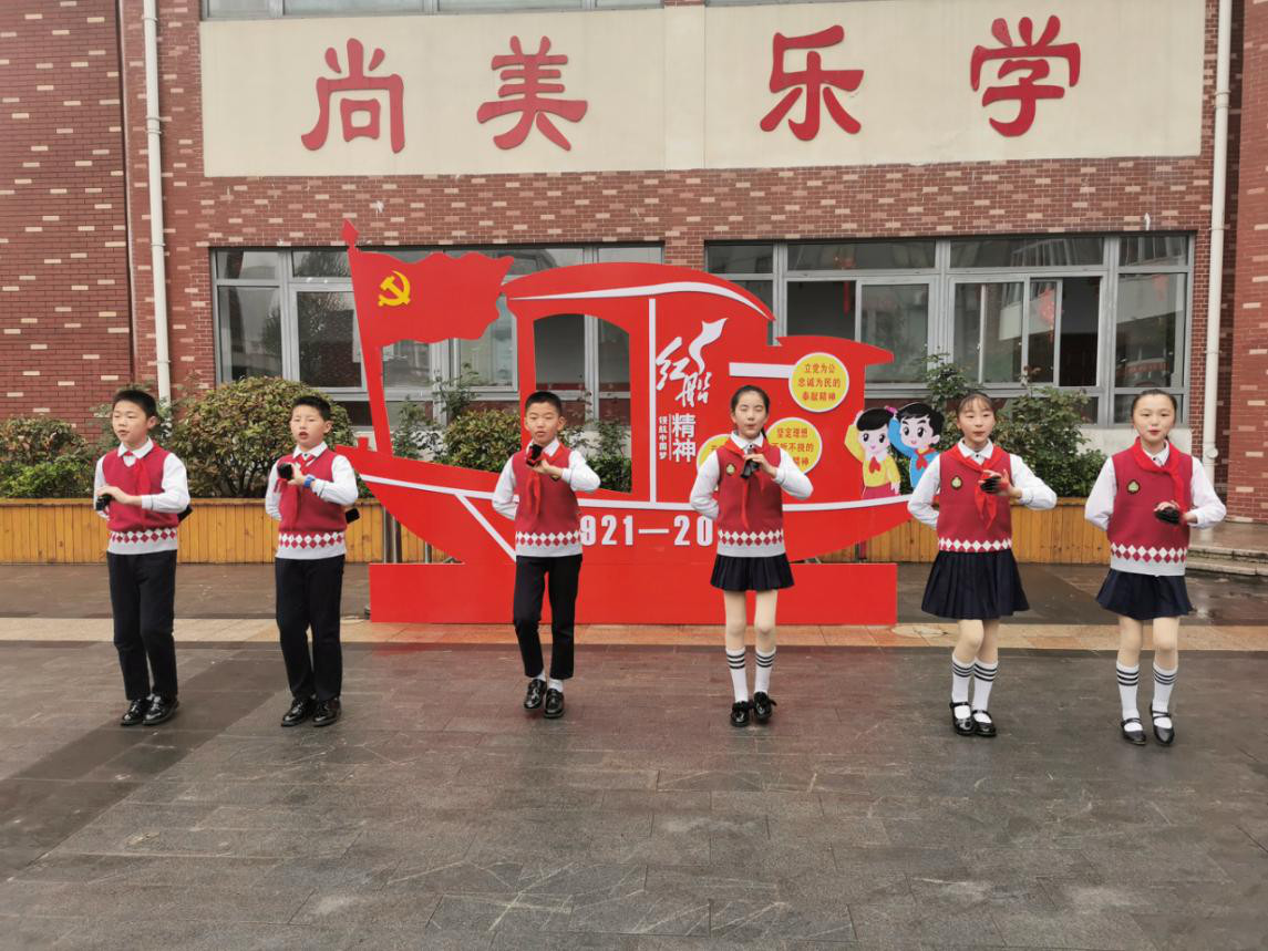 4月12日是星期一,一大早廣場「紅船」前圍滿了小隊員,瞧!紅領巾宣講小隊一邊敲打快板一邊歌頌抗疫、抗洪的英雄們,膾炙人口的傳唱把黨的先鋒精神浸潤到孩子們的心中。當天上午8時左右,雄壯的《義勇軍進行曲》響徹整個校園,城市之光小學的孩子們在國旗下整齊地唱國歌。升旗儀式結束後,新增的「黨史講堂」環節如約而至,該校黨員老師通過講故事、誦讀詩詞等形式向孩子們宣傳一百年來我們黨經歷的風風雨雨。孩子們聽得認認真真,在誦讀詩詞環節,全體學生跟隨老師一起誦讀了《七律·長征》。