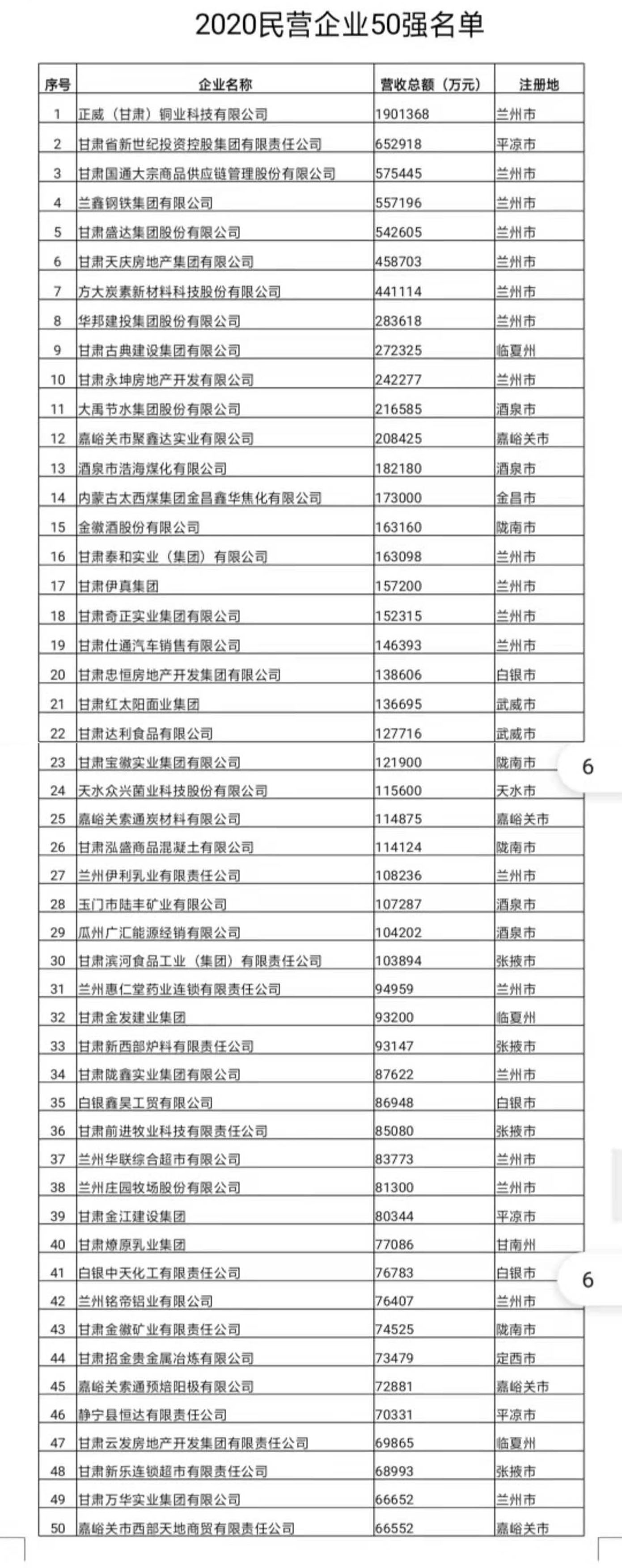 其中,正威(甘肅)銅業科技有限公司190.13億元,甘肅省新世紀投資控股集團有限責任公司65.29億元,甘肅國通大宗商品供應鏈管理股份有限公司57.54億元,蘭鑫鋼鐵集團有限公司55.71億元,甘肅盛達集團股份有限公司54.26億元排前五位。從甘肅省內來看數量和質量都在逐步提高,但從全國來看,差距仍在不斷擴大。