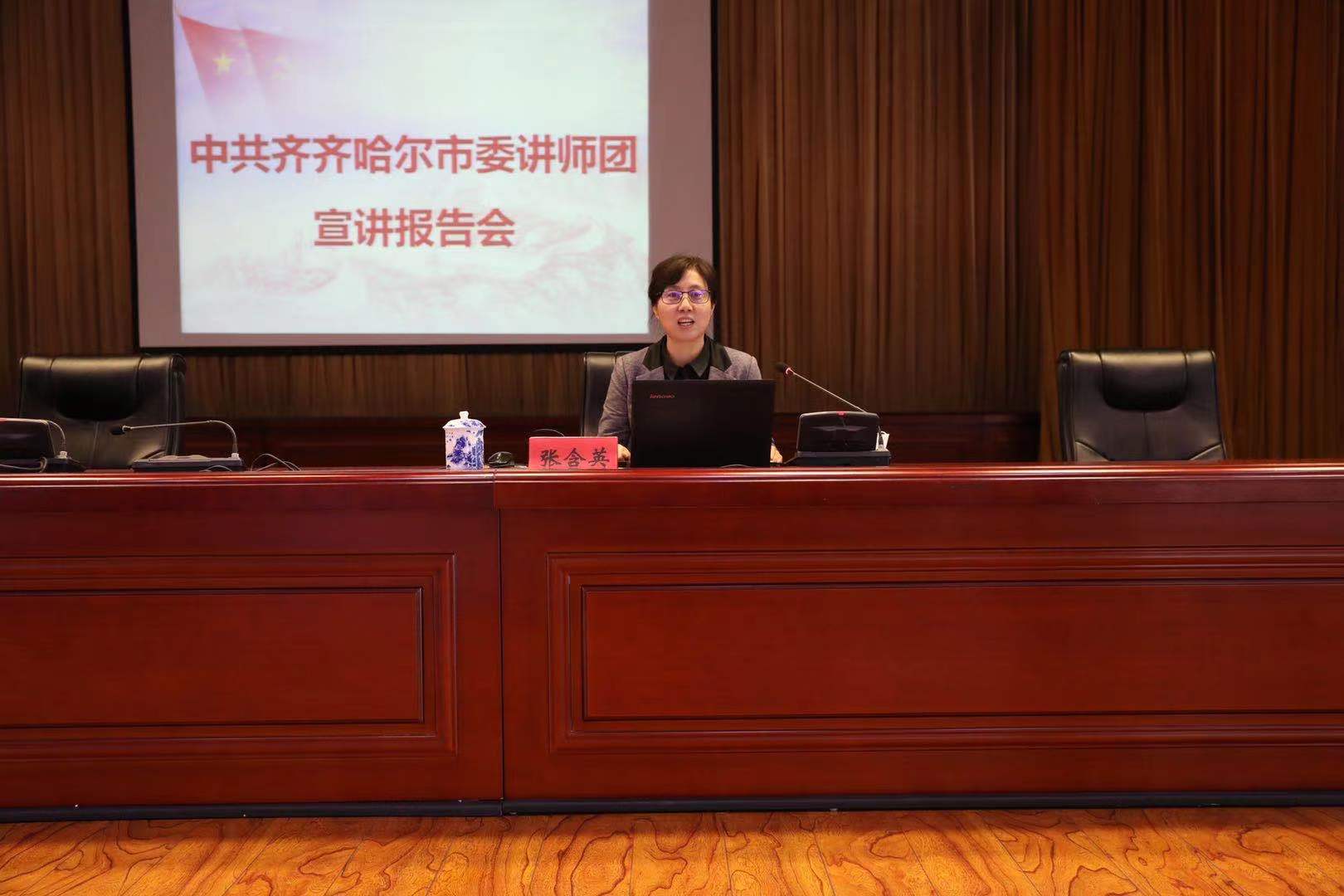 報告會上,齊齊哈爾市委宣講團成員、市委黨校副教授張含英作宣講報告。報告中充分認識開展黨史學習教育的重大意義、認真研讀黨史基本著作全面了解中國共產黨百年奮鬥的光輝歷程和歷史性貢獻、深刻把握黨史學習教育的重點,增強『四個意識』、堅定『四個自信』、做到『兩個維護』,凝聚鶴城振興發展的強大力量」四個方面進行了深入講解,既有理論闡釋、又有案例剖析,既有政治高度、又有實踐深度,使參會人員對開展黨史學習教育的重大意義、目標要求、重點任務,又有了更全面的認識和更深刻的理解,對於全體黨員幹部更好地學習黨史、做好當前各項工作具有重要的指導作用。