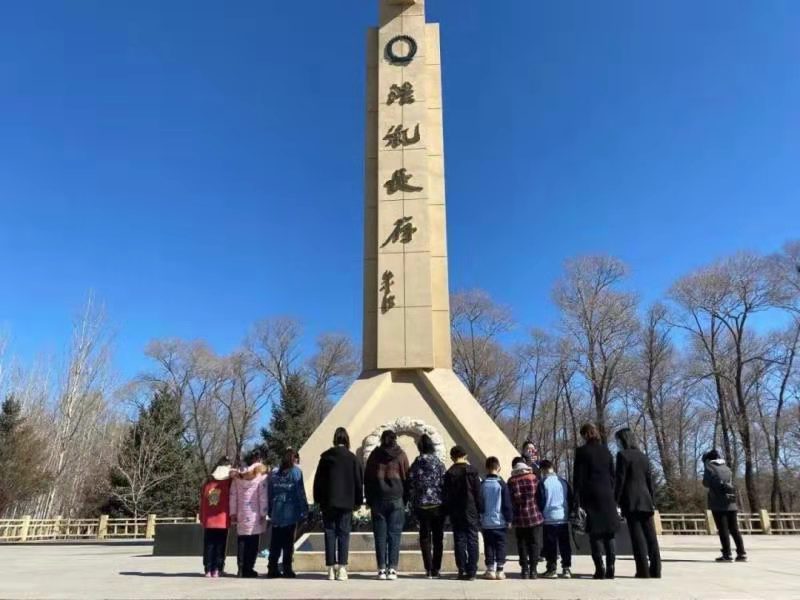 在富裕縣烈士陵園,團富裕縣委的工作人員正帶領「童伴媽媽」及「童心港灣」留守兒童共同「緬懷先烈偉績,傳承紅色基因」。