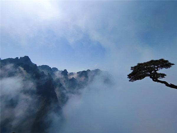 4月13日,安徽黃山在連綿春雨後,天空逐漸放晴露出了久違的那抹湛藍。清晨,一輪紅日徐徐升起,東方的天際、山峰、樹梢,都被撒上一層瑰麗無比的錦緞,絢麗奪目。