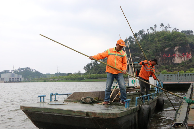 4月14日上午,在安徽黃山市屯溪區新安江延伸段步行棧道旁,水面保潔人員正在對水面的垃圾和水草進行清理,確保新安江流域水清岸。