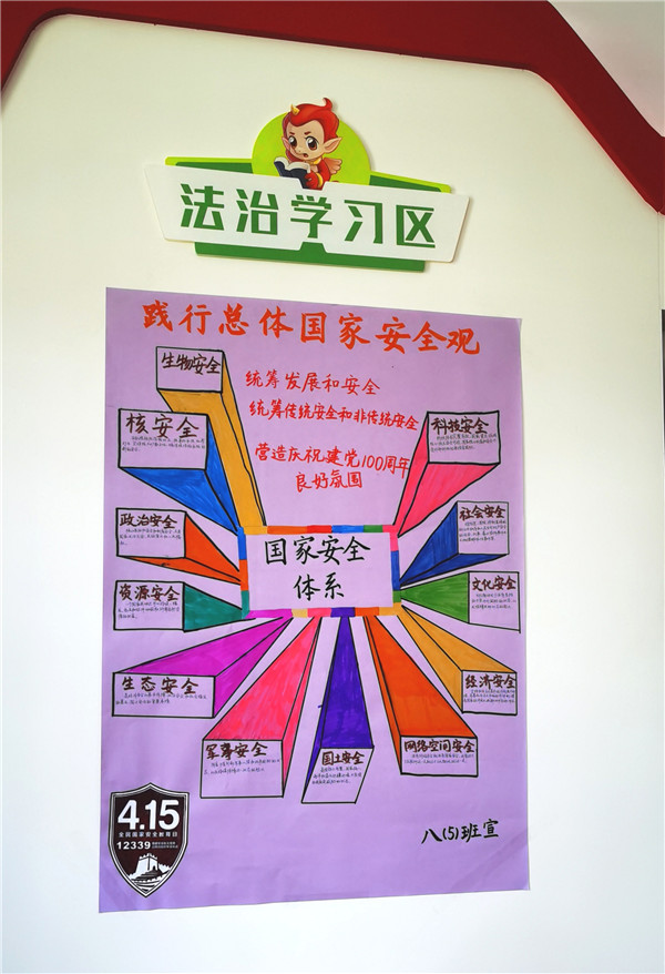 該校通過基礎課程「走進來」、專題教育「請進來」、活動課程「走出去」三類平台,運用「愛法樂學」中小學法治課堂教學系統、AI互動課桌,開展一至九年級《道德與法治》課堂學習,並利用各類資源讓學生了解和樹立國家安全觀意識。