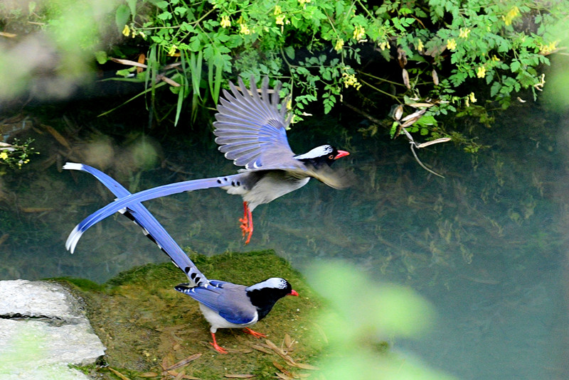 4月15日,記者在安徽黃山市休寧縣璜尖鄉境內拍到一群紅嘴藍鵲有的在樹叢中跳躍嬉戲,有的在水潭邊飲水歡歌,空中滑翔的姿勢更是無比漂亮。