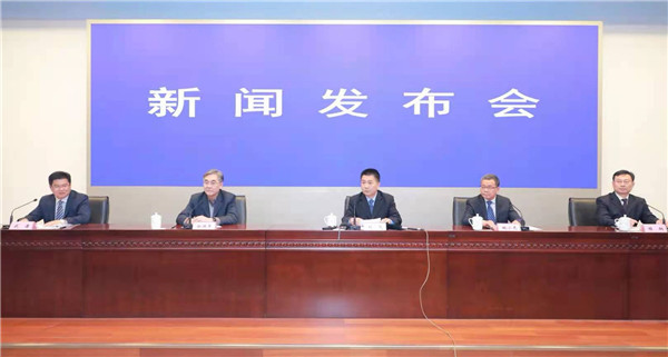 2021年一季度安徽自貿試驗區建設情況新聞發佈會現場,左起:安徽省委宣傳部新聞發佈處處長武瀟主持發佈會,省市場監管局二級巡視員徐洪軍,省商務廳副廳長、省自貿辦常務副主任劉光,省委編辦二級巡視員姚小虎,省地方金融監管局副局長程鋼(孫軍/攝)