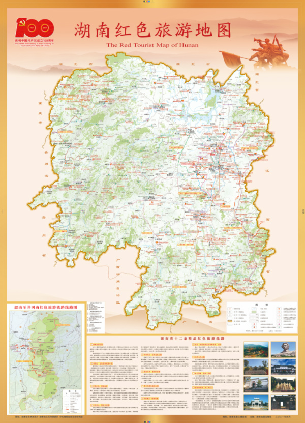 據介紹,《湖南黨史學習教育地圖》以湖南省普通地圖為底板,嵌入人物、事件和紅色資源等要素,圖文並茂,直觀呈現重要黨史人物、重大事件和重要紅色遺蹟,着力勾勒紅色瀟湘最美模樣。該版地圖收集了建黨百年343位、397人次湘籍重要黨史人物簡介;建黨百年湖南重大事件120餘件、湖南重大黨史事件52件和解放後歷次代表會議、代表大會簡述18條;革命老區縣(市、區)104個;就近就地開展黨史學習教育現場教學場地推薦名單118處和有關行業系統開展黨史學習教育現場教學場地推薦名單89處;紅軍長征經過湖南線路圖,井岡山、湘鄂西、湘贛、湘鄂贛和湘鄂川黔五大革命根據地鬥爭形勢圖等圖件。