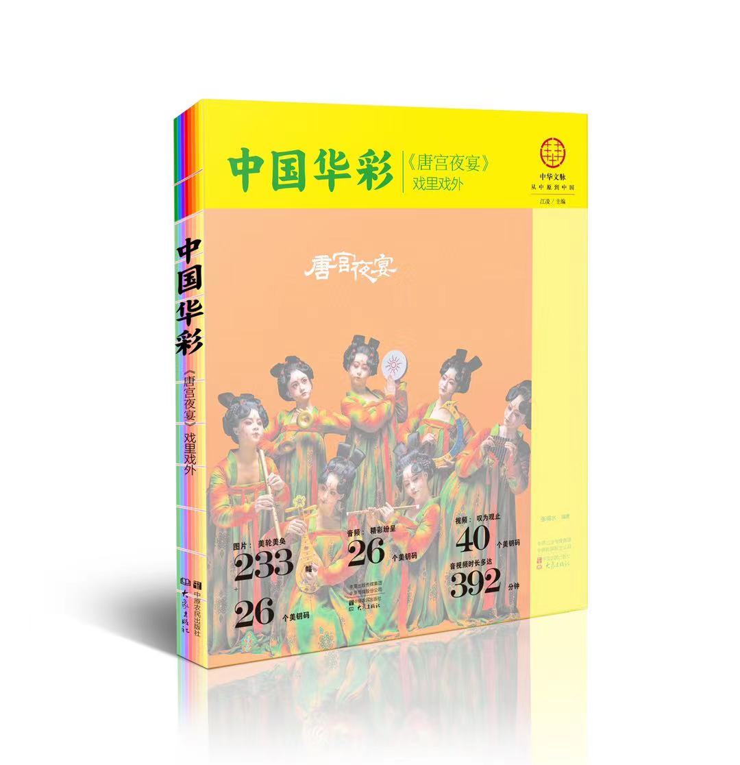 《中國華彩——<唐宮夜宴>戲裏戲外》,以春節時期爆紅出圈的舞蹈節目《唐宮夜宴》為基礎,採用9條線多角度解析方式,以樂俑復活、整理妝容、入宮表演至曲終人定等7個節點概括《唐宮夜宴》故事線。全書充分利用了二維碼、美鑰碼等現代科技手段,集中了舞台定妝照、賈湖骨笛等文物照、《千里江山圖》等名畫的高清圖共233幅,關於音樂演奏、古畫講評的音頻資料88分鐘;對文物、舞蹈及AR技術的描繪視頻等304分鐘,以文圖並茂、音視頻疊加、趣味十足的方式介紹了舞蹈中相關的文物、服飾妝容、書畫精品、樂舞器具,並詳細解析了舞蹈背後的策劃製作團隊,揭密了成功背後的種種細節。