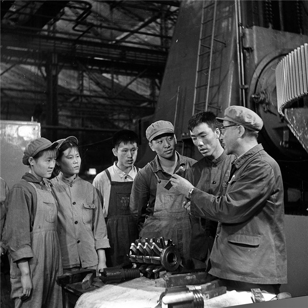 「1974年6月初,工廠提出了『大干苦幹鐵乾沒完,堅決完成上半年生產任務』的戰鬥口號,職工們為完成生產任務,加班加點吃住在廠,機床二十四小時不停運轉。我作為瀋陽重型機器廠工會的一名專職攝影師,被這火熱場面所感動,我背起相機走進車間,拍下了工人們在雙頭車上,精心加工破碎機滾筒的繁忙場面。」陳雷老師站在自己47年前拍攝的這張照片下滿眼回憶地說。