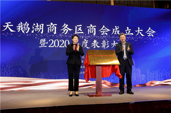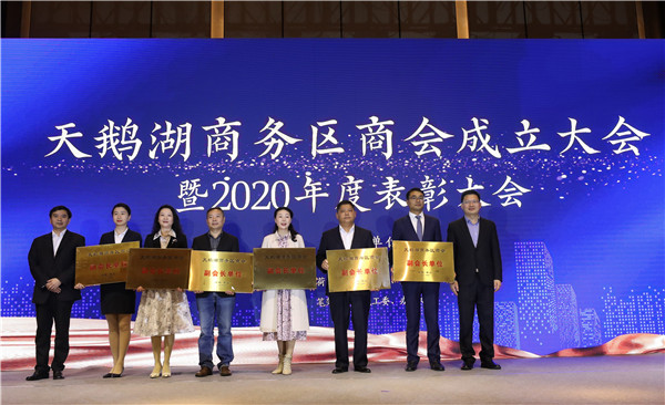成立大會上,舉行了揭牌及授牌儀式,天鵝湖商務區商會與杭州市上城區中央商務區商會進行戰略合作簽約。這兩家商會未來將繼續加強深層互動、信息共享、交流合作,促進商務區資源互通、優勢疊加,發揮出「1+1>2」的效果。此外,還對商務區優秀企業進行頒獎,根據企業所取得的不同成就,分別授予「黨建金天鵝獎、五星管家獎、公益之星獎、防控尖兵獎、創新動力獎、新銳力量獎和卓越貢獻獎」。