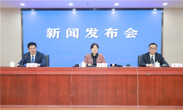 2021第十四屆安徽國際茶產業博覽會新聞發佈會現場,左起:安徽省委宣傳部新聞發佈處處長武瀟主持發佈會,省供銷社理事會副主任杜愛玉,省農業農村廳副廳長王紅,先後介紹有關情況並回答記者提問