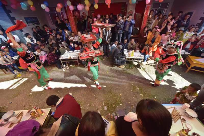 同時實施跳菜「五個一百」工程,分兩批命名了「跳菜名人」87人,「跳菜名隊」33支,「跳菜名村」31個,「跳菜舞台」21座,「跳菜名店」21家。同時,利用現有230支文藝隊2000多名跳菜藝人的文化資源優勢,積極拓展跳菜演藝市場,隨着跳菜隊的持續發展和參與跳菜人員的逐步壯大,不僅豐富了農村群眾的文化生活,也為南澗脫貧攻堅闖出了一條新路。據介紹,跳菜隊員每天收入一般為200~400元不等,一年下來,每位農民跳菜隊員能夠獲得4萬元以上的收入,跳菜隊通過向喜宴承辦單位和家庭提供跳菜表演服務獲得了較好收益。