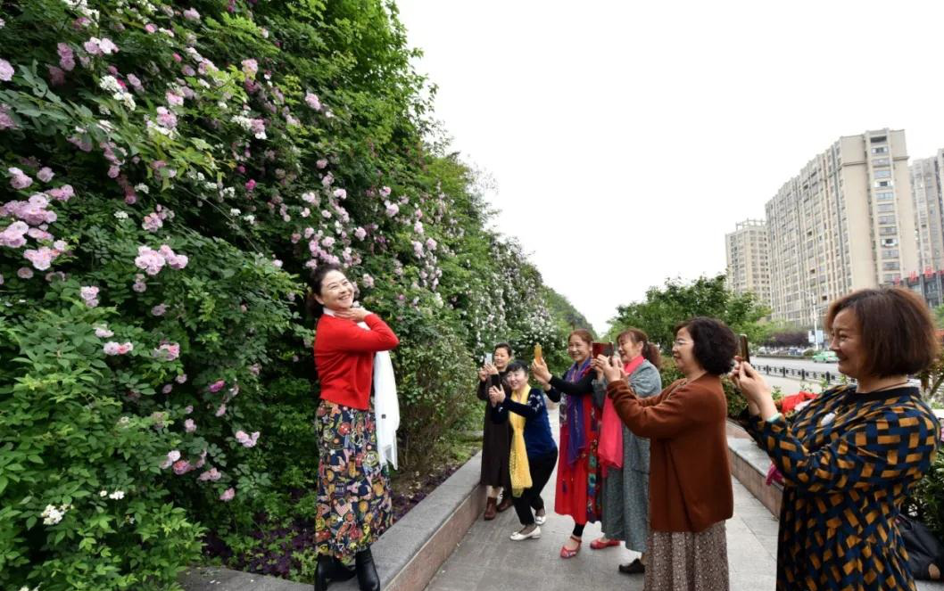4月25日上午,我們來到這裡看到,這條花牆長約100米,高約3米,在一大片枝枝蔓蔓的綠色里,薔薇花倚靠在圍牆上,悄然舒展的花瓣層層疊疊,裊裊婷婷,隨風搖曳,將圍牆編織得如詩如畫。成千上萬朵粉色花朵帶來陣陣香氣,一些愛美的市民還專程來此打卡拍照,留住笑顏和美景,感受巢城最美的時節。