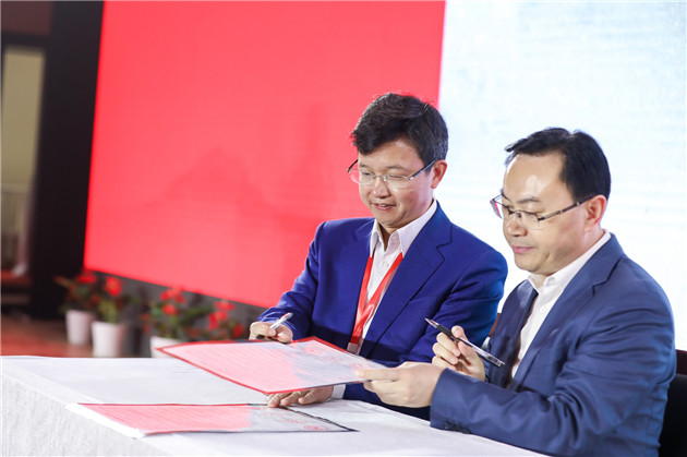劉仲華(右)、王嶽飛(左)簽署《關於浮梁茶的七點共識》