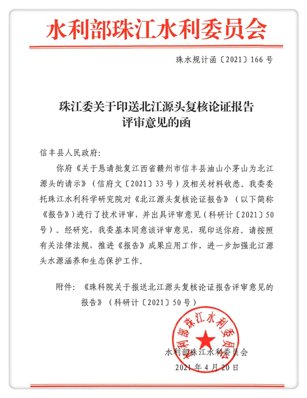 2020年8月,中共贛州市委、贛州市人民政府出台《關於支持信豐縣建設高質量發展示範先行區的意見》,《意見》明確支持將北江源保護開發納入省「十四五」水安全保障、生態環境保護規劃,支持信豐建立北江流域上下游橫向生態補償長效機制,支持設立北江源鎮。為推進北江源流域綜合治理舉措早日實施及進一步加大源頭生態保護力度,信豐縣委、縣政府主動與水利部珠江水利委員會對接匯報,特懇請水利部珠江水利委員會批覆認定江西省贛州市信豐縣油山鎮油山村小茅山為北江源頭。