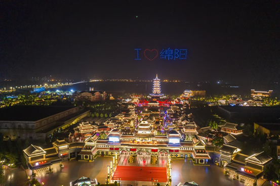 到了夜晚,百架無人機準時起飛,在天空盤旋飛翔,變換出各種造型。園區裏的經典項目、熊大熊二的可愛模樣、還有「I❤綿陽」的巨大標誌……在遊客們的陣陣歡呼聲中,無人機完成了首次亮相,為五一歡樂假期更添一抹精彩。在每晚歡樂時光結束的前夕,綿陽方特為遊客們燃起浪漫煙火。點點火光直衝雲霄,炸成一朵朵炫彩奪目的煙花,將夜空裝點成一副五彩斑斕的畫布。在火光的映襯下,遊客們暢玩一天的好心情在此刻得到延續。