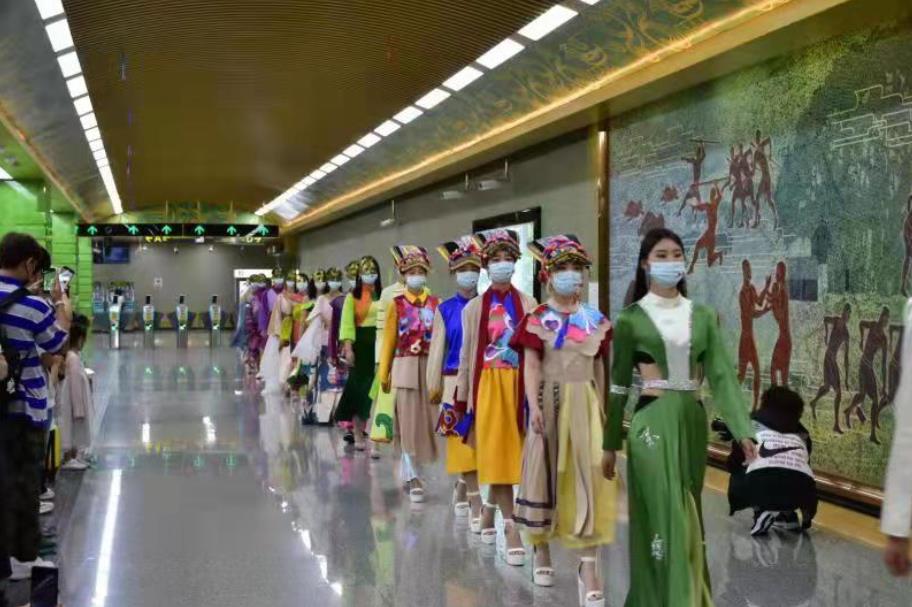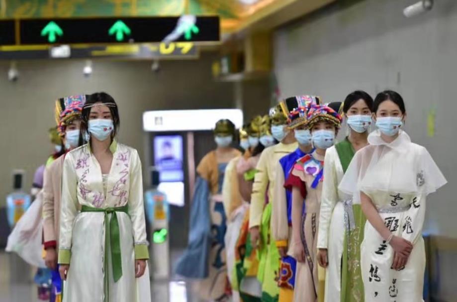 在2021年「五四」青年節來臨之際,四川綿陽飛行職業學院、綿陽泛美飛行職業技術學校的同學們來到成都金沙博物館網紅地鐵站進行了一場「致敬五四」的時尚快閃活動,通過「神秘三星堆」、「國風顏如玉」、「夢回古蜀」等國潮范兒走秀、舞蹈等表演向廣大乘客展現了傳統文化和航空文化的魅力。
