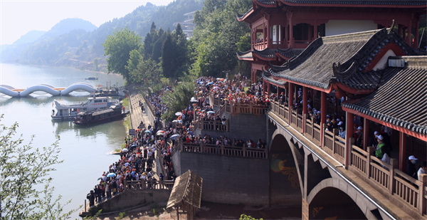 遊客在蓬安嘉陵第一桑梓景區-觀百牛渡江奇觀