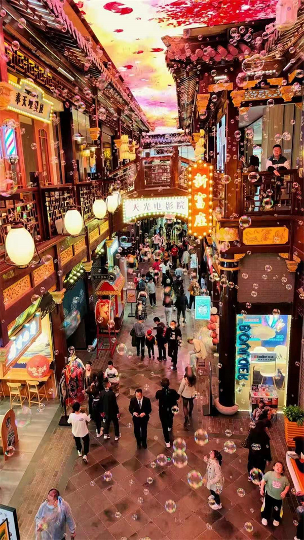 僅有“俊俏”的外表無法獲得持久的“流量”,對此,中街在提升“外在”的同時,還着重打造“日觀光+夜經濟”的商旅文一體化模式。通過打造具有歷史背景的特色胡同、增添非遺元素、注入現代科技化原色,讓這條“百年老街”從早到晚都熱鬧非凡。