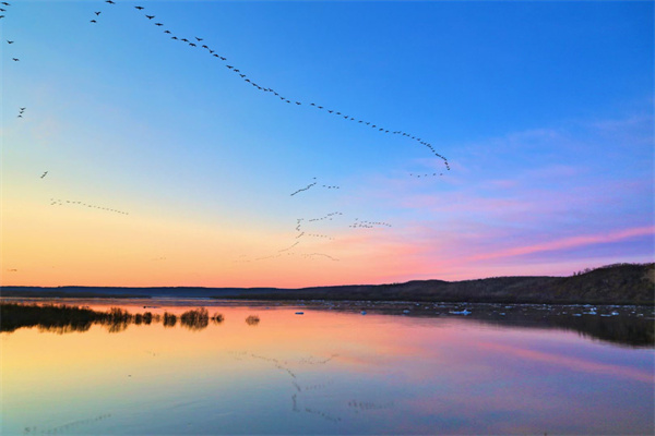 隨着氣溫逐漸轉暖,五一期間,中俄界江黑龍江呼瑪段開江,連續多日出現大批大雁北歸,在黑龍江上空盤旋,水天一色,與美景相擁,自然而純粹。在春風的吹拂下,楊柳、花草紛紛露出嫩芽,與藍天白雲一同繪就了一幅美妙的原生態美景。