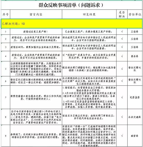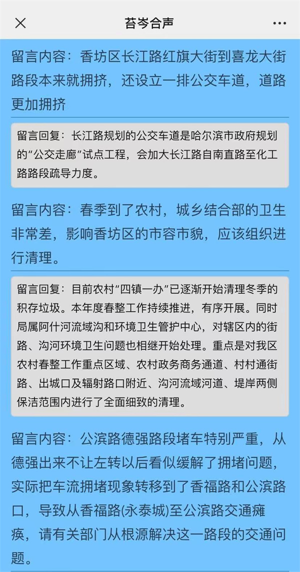 精細推進見實效。「為民服務留言板」上線一個月來,已收集統戰人士留言75條,其中意見建議38條,尋求幫助解決困難37條,從各個層面反映着基層的困難事、群眾的煩心事以及統戰人士對區域經濟社會發展的建言獻策。經梳理分類後,這75條留言被細分為88個問題,並由區委統戰部以函的形式轉發給20家相關單位。截至目前,已有包括統戰部在內的18家單位回復69條留言,其中:已解決25條,未解決44條,並有8條留言的處理結果通過「苔岑合聲」平台反饋給當事人,讓留言板不僅是一個「辦實事」的平台,更是一個「匯民智」的平台。民有所呼,我有所應。下一步,針對未解決的留言,區委統戰部將着力推進核辦,切實解決統戰人士反應強烈的突出問題,在為民排憂解難中自覺踐行初心使命。(記者 王琳 香坊區委統戰部供稿)