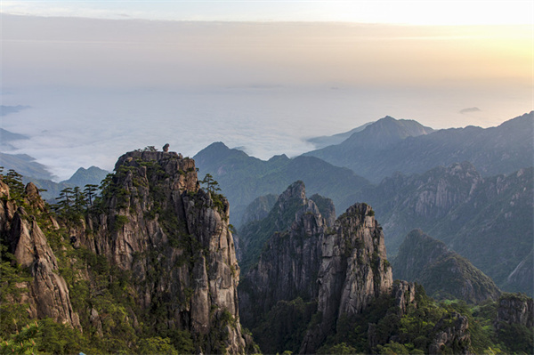 黃山 的日出宛如人間仙境,在雲霧繚繞中與大自然共同享受美景,舉目望去,遠方是朦朧的山景,頗有一種仙人淩駕於萬山之上的真實感受,仿佛已經遠離塵世間的嘈雜,天上的仙境,沒有世俗雜念的纏身,沉醉在這一方美景裏。