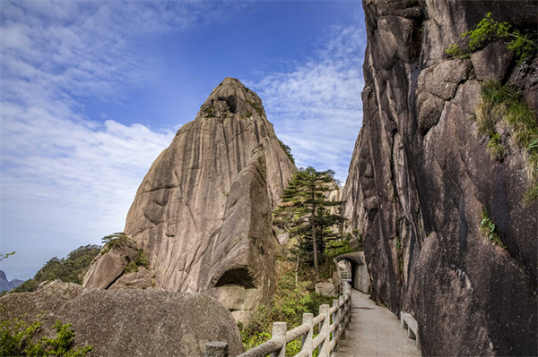 青松 在懸崖上叢立,怪石在山峰上鬥豔,雲海在岩壁上流淌,在絕壁上開鑿了一條進山的 通道 ,看著眼前這一段路,就能感受到 黃山 的陡峭。