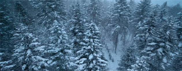 大幕拉開,風雪交加,一望無際的茫茫林海里,是故事的開局之地。航拍&第一視角的真實感鏡頭為我們呈現出開局的困頓感和林海雪原環境的壯美大氣。