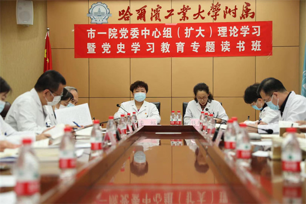 5月13日晚,哈爾濱市第一醫院行政樓會議室燈光明亮。按照哈爾濱市衛健委黨委通知要求,哈爾濱市一院黨委中心組(擴大)理論學習暨黨史學習教育專題讀書班開班。醫院黨政領導班子成員、基層黨支部書記、重點崗位職能科室負責人等黨員幹部利用下班後的業餘時間,參加這次深化政治理論暨黨史學習教育的集中專題學習。理論學習中心組(擴大)成員聚焦學史明理、學史增信、學史崇德、學史力行,深刻體悟黨的創新理論,進一步統一了思想認識,堅定了信仰信念,樹牢了初心使命,強化了責任擔當。黨委書記錢朝霞主持學習會。