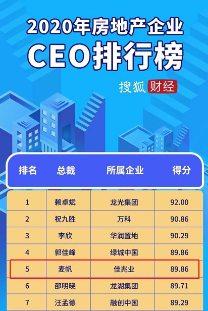 5月14日,搜狐財經發佈2020年房地產企業CEO排行榜,佳兆業集團董事局副主席兼總裁麥帆位列榜單第五名,卓越的企業領導力獲得權威機構認可。此榜單由搜狐財經根據過去一年的銷售表現、往期銷售利潤結轉、降負債情況、為股東創造財富的能力等方面,分絕對值和相對值,共7個項目進行打分,製作出客觀榜單,麥帆以89.86分位列行業第五名,與萬科、華潤置地等上規模企業經理人同列。
