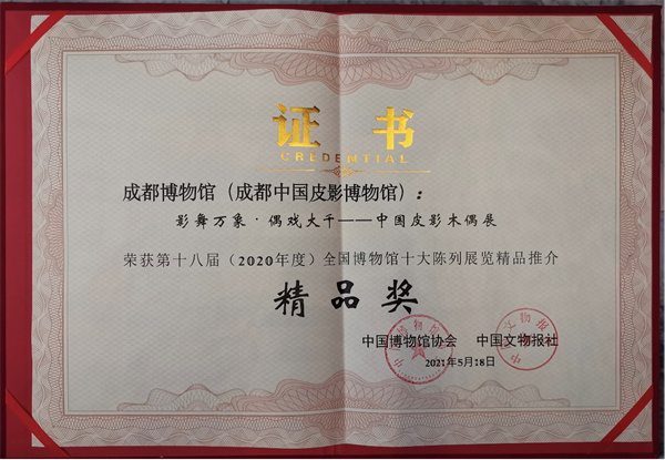 2021年5月18日,第十八屆(2020年度)全國博物館十大陳列展覽精品推介活動頒獎儀式在北京首都博物館盛大舉行。成都博物館申報的「影舞萬象 偶戲大千——中國皮影木偶展」脫穎而出,榮獲「全國博物館十大陳列展覽精品推介精品獎」。
