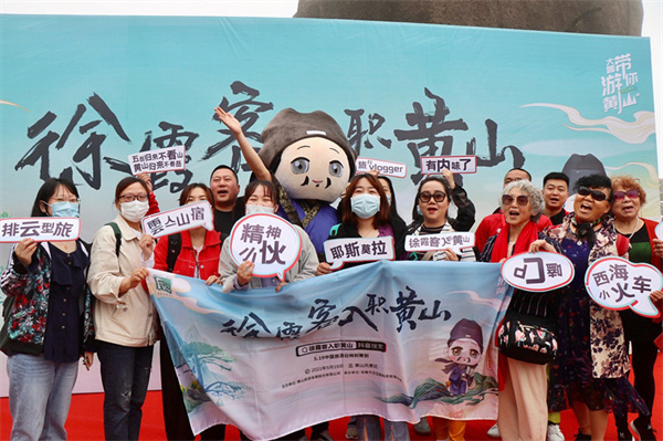 活動當天,黃山旅遊首席旅行體驗官“徐霞客”亮相黃山玉屏樓廣場入職儀式,身披素衫,頭戴萌趣頭套的他與在場遊客熱情互動並贈送黃山精美文創產品,給大家帶來了穿越時空的新奇體驗。