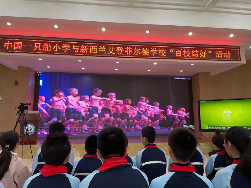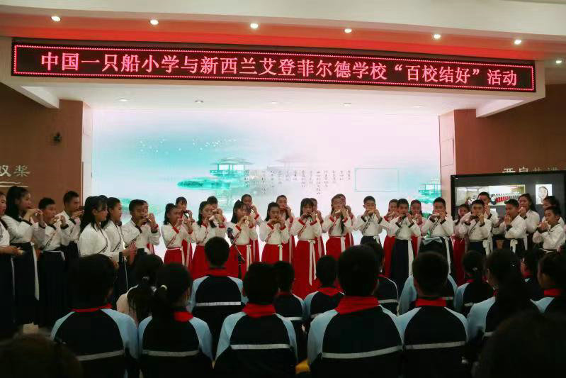 兩校的60多名小學生分別展示了各具特色的民族文化和校園活動。新西蘭小學生表演的毛利舞蹈和一隻船小學生吹奏的陶笛相映成趣,用極具特色又喜聞樂見的藝術方式搭建起了兩國小學生友好交往的橋樑。