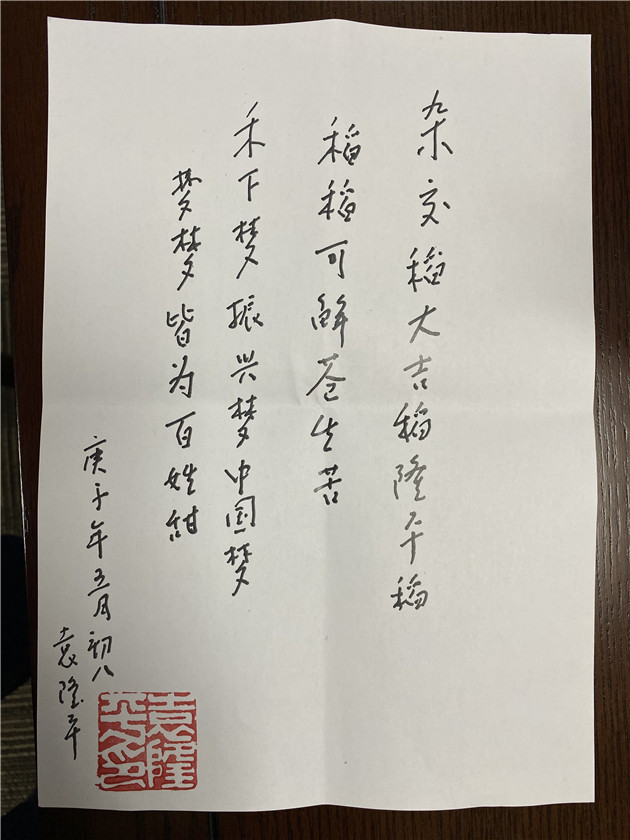 「雜交稻大吉稻隆平稻,稻稻可解蒼生苦;禾下夢振興夢中國夢,夢夢皆為百姓甜。」這是袁隆平院士為黃埔區大吉糧倉親筆題寫的對聯。