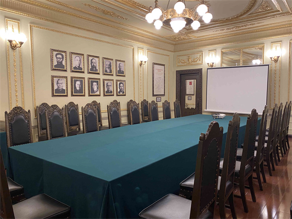 米黃色油漆的牆壁、厚重華麗的歐式門窗、座椅、吊燈、壁燈……記者走進今天的馬迭爾賓館二樓一號會議室,奢華氣派的歐陸宮廷風格裝飾映入眼帘。「這間就是中共中央代表與在哈的民主人士進行三次會談的會議室,我們將這裏修繕成如初的模樣,保留這份歷史印記。」宿冬琴向記者介紹着。