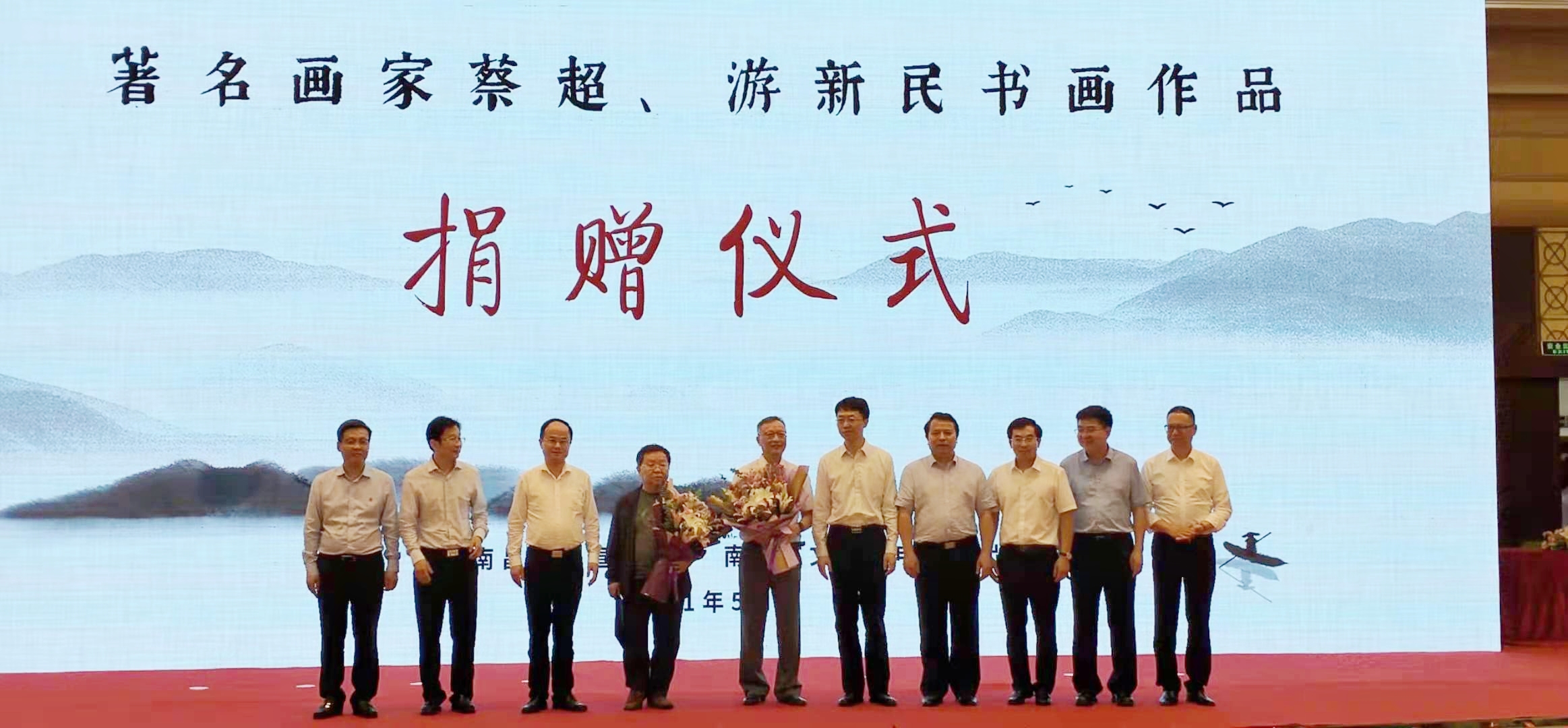 5月29日,著名畫家蔡超、游新民國畫作品捐贈儀式在江西南昌舉行。江西省委宣傳部副部長、省新聞出版局局長黎隆武,省文聯主席葉青,省文旅廳副廳長陳曉平,南昌市委常委、宣傳部長龍和南,市政府副市長宋鈾,市政府副市長李松殿以及相關部門負責同志參觀作品展並參加捐贈儀式。