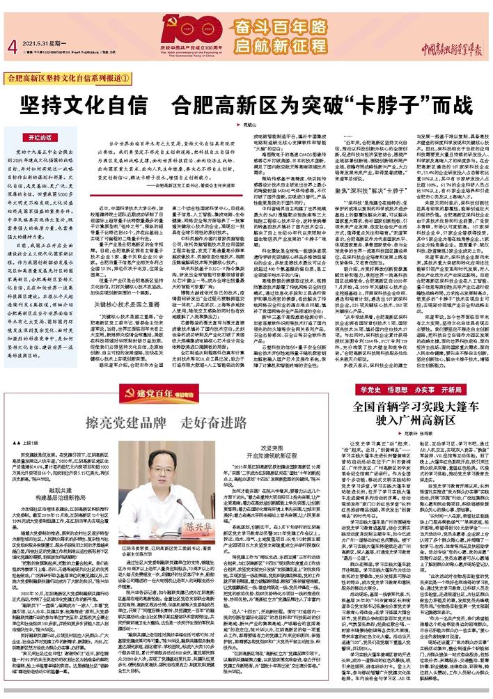 5月31日起,由科學技術部主管的《中國高新技術產業導報》將推出「合肥高新區堅持文化自信系列報道」,旨在系統而深入地展示合肥高新區在當今世界面臨百年未有之大變局、國際國內環境發生深刻複雜變化、面對更加激烈的科技競爭中,堅持文化自信、建設世界一流高科技園區的心路歷程。