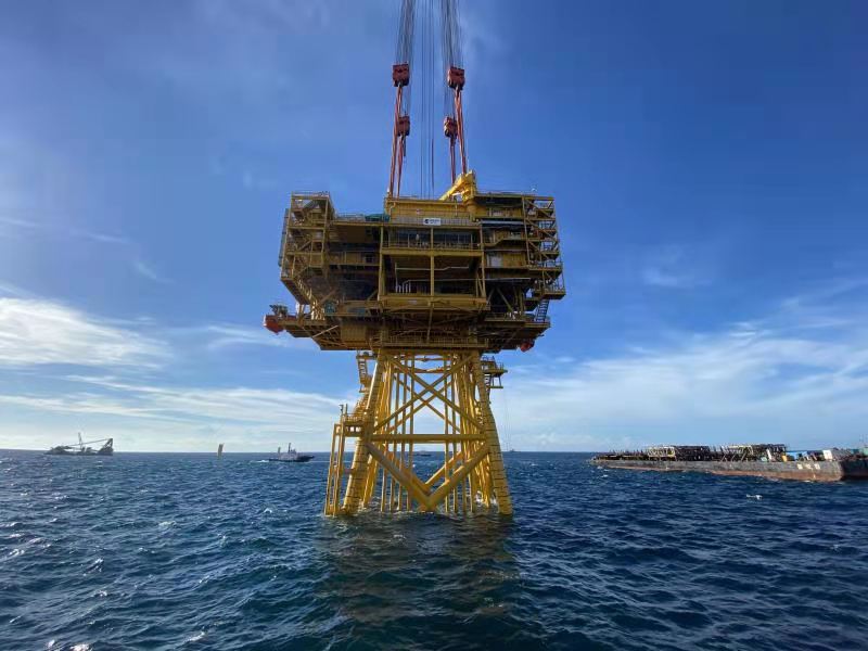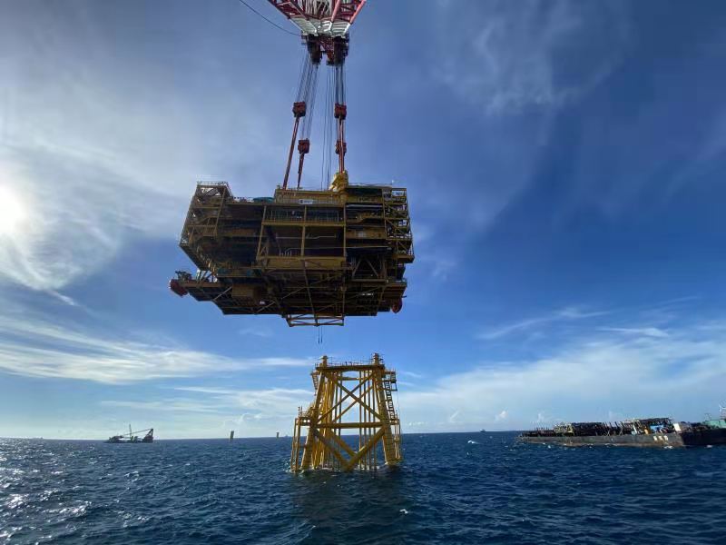 此次吊裝的海上升壓站上部組塊建設採用陸上整體建造,海上一體化吊裝的方式進行,整個上部組塊採用五層布置,平面尺寸約為47米×35.4米,高約24米,頂層距平均海平面約46米,重約2800噸,是目前為止亞洲最高、單體最重的海上升壓站。