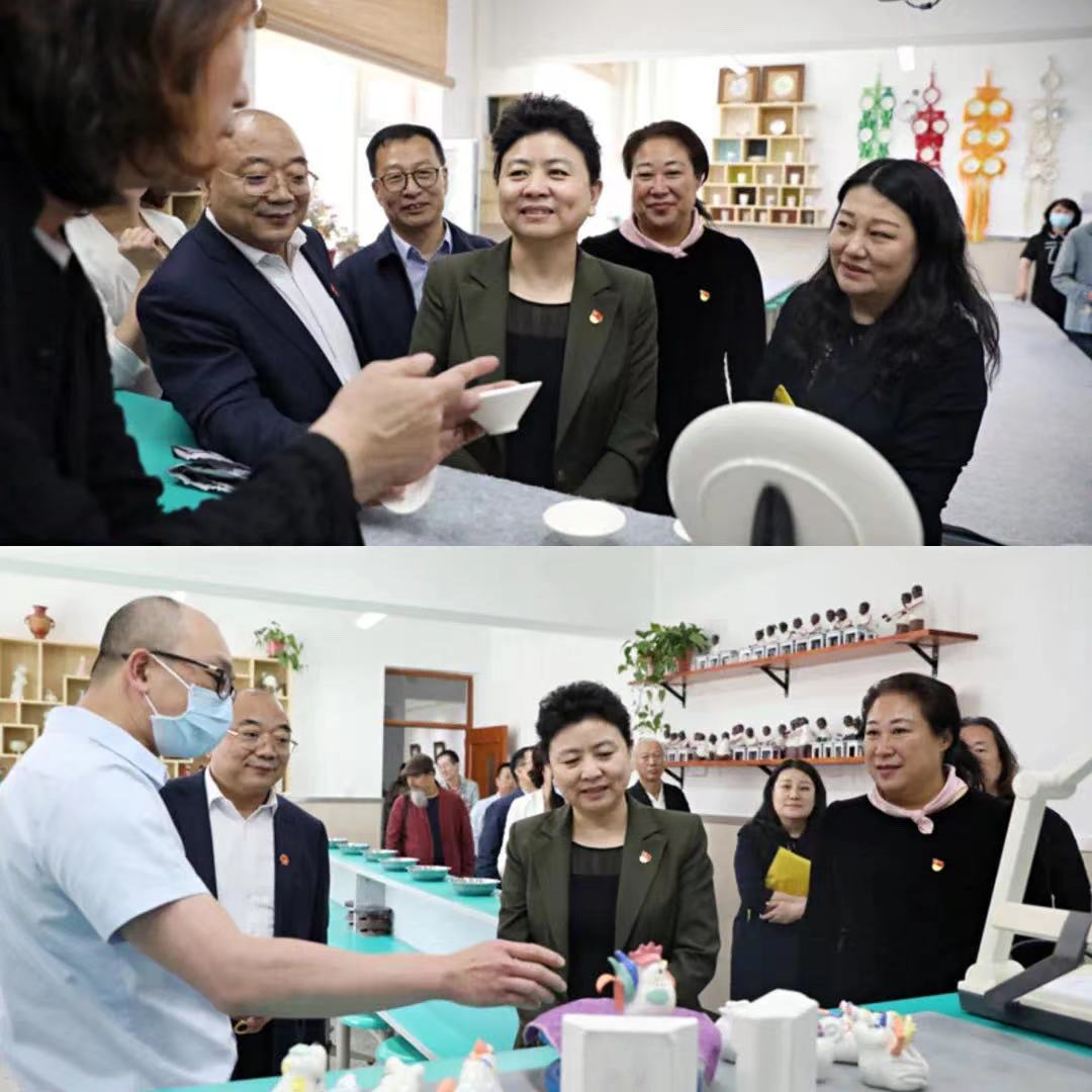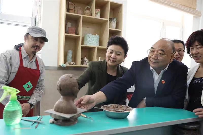 隨後,領導和嘉賓們參觀了工藝品陳列廳,陶藝捏塑、翻模教室,窯爐室,大師藝術工作室。體驗了古法草木染布工藝流程,親身感受傳統工藝的神奇與魅力。當領導們來到陶藝教室,恰好碰到陶藝專業的姚雷老師正在為建黨百年進行創作,看到袁隆平院士的塑像時,領導們對專業教師能夠緊扣時代、抓住紅色教育主線,並能通過踏實過硬的專業基本功將愛國主義、民族精神融入到創作的作品中,為技藝的精湛叫絕、為學校能有這樣一批名優教師隊伍而讚嘆!