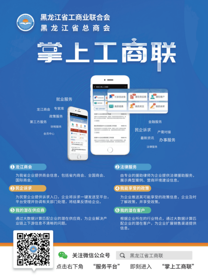 日前,黑龍江省民營經濟服務平台暨「掌上工商聯」正式上線運行。該平台是黑龍江省工商聯抓住資訊時代發展機遇,聯合「哈工大軟件」創新工作模式,為全省民營企業搭建的服務平台,旨在重點解決民營企業政策獲取不及時、供需銜接不順暢、服務諮詢不便捷、業務查辦不系統等問題,為黑龍江省民營企業提供「信得過、找得到、用得上」的綜合性服務。
