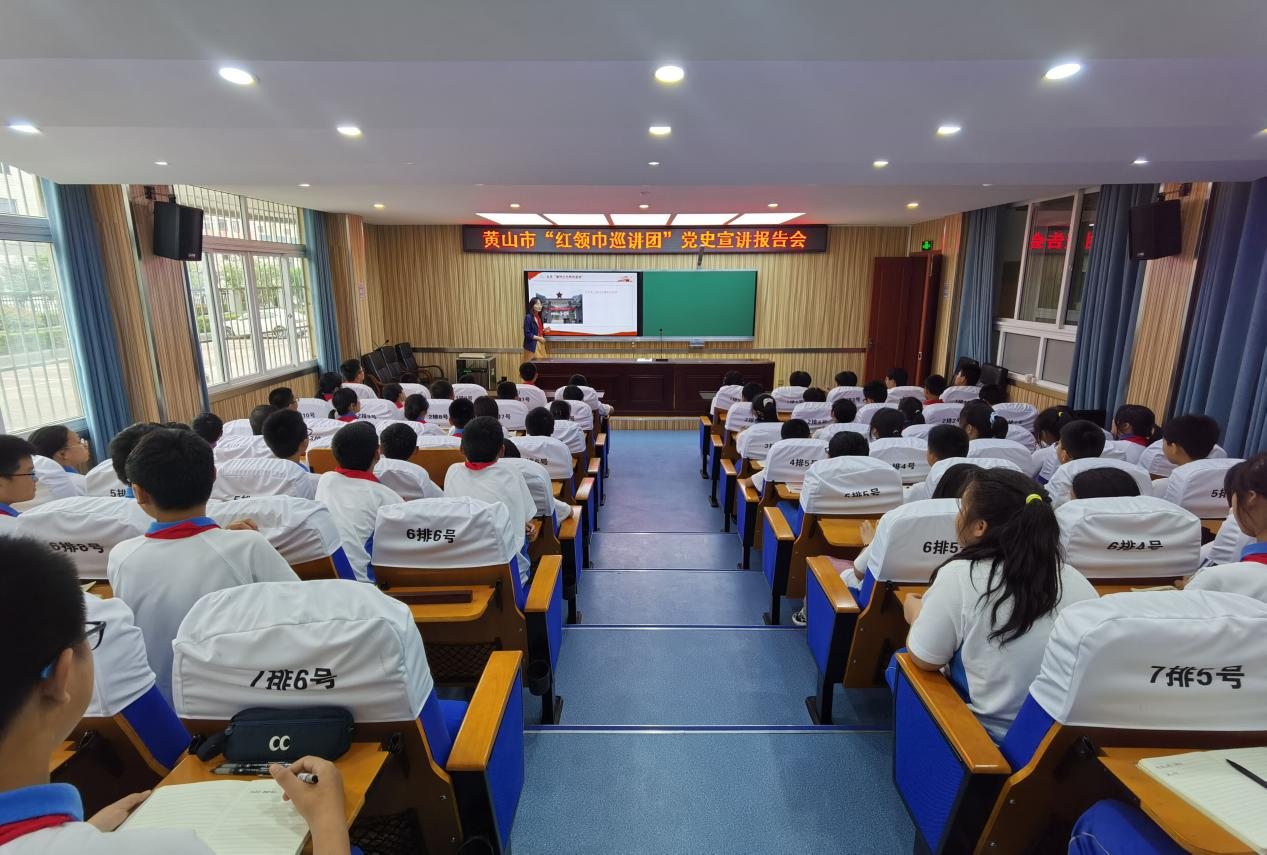 在徽州二中,徽州區團委為初一學生帶來了一場“舉旗幟·送理論”黨史學習教育專題宣講報告會,活動以“銘記徽州黨史,傳承紅色基因”為主題,結合徽州黨史,用講故事的方式生動描述了陳毅、葉挺、劉伯林等人為國奉獻的英雄事蹟,引導少先隊員們樹立了正確的黨史觀,切實增強開展黨史學習教育的政治自覺和行動自覺。