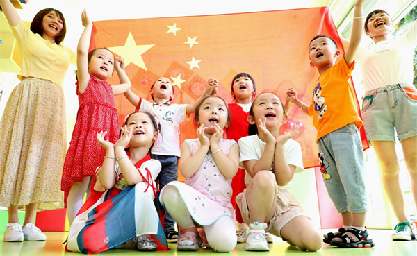 6月1日,安徽歙縣楓韻少兒服務中心班級小劇場熱鬧非凡,小朋友們在演唱《紅星照我去戰鬥》。