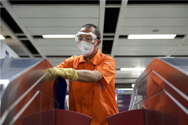 廣州鐵保潔人員正在消毒車站設備