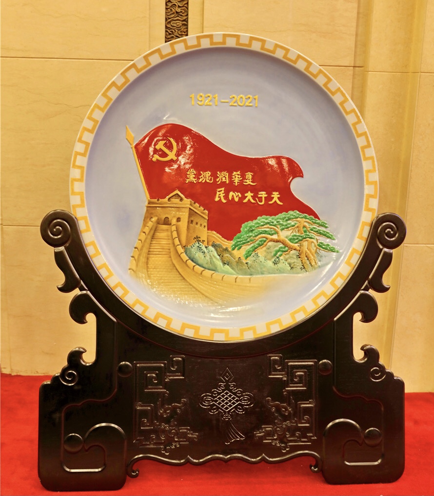 該紀念寶盤直徑1.2米,全重150公斤,選用我國極品高領土手工拉坯,圖案全部手工雕刻。寶盤中央是鮮紅的黨旗,下面長城、松樹預示著在中國共產黨的領導下國富民安,萬古長青。(記者 楊秀嶺)