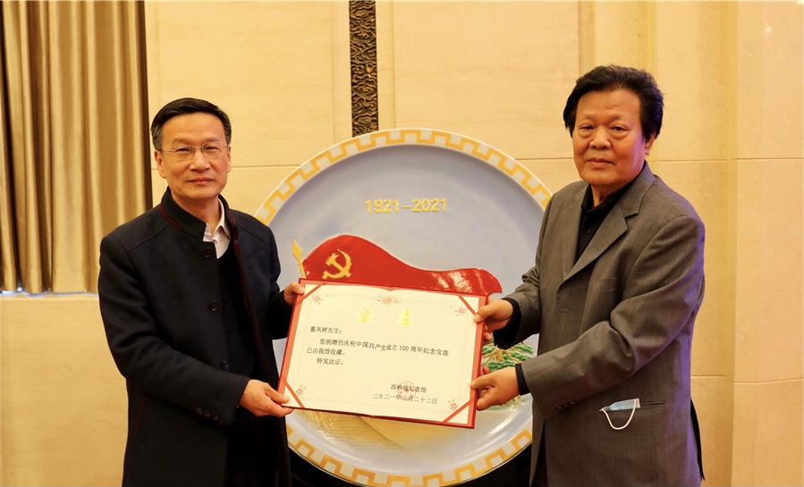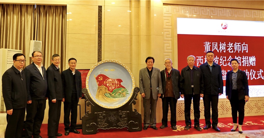 為慶祝中國共產黨建黨100週年,當代著名書法家董鳳樹特別創作「黨魂潤華夏·民心大於天」紀念寶盤贈西柏坡紀念館。