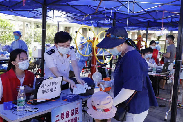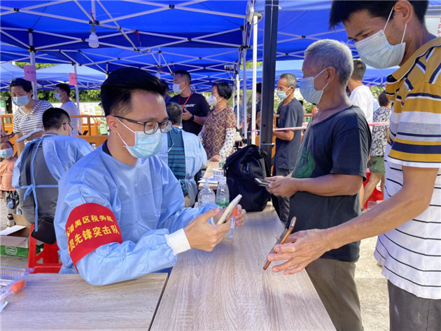 在各個核酸檢測採樣點,這樣的稅務黨員幹部還有許多。「稅務老兵」羅志衛通宵達旦在檢測點進出口協助維持秩序,擁有30多年黨齡的黃毅虹顧不上肩周炎的老毛病主動奔赴防疫一線……他們有的揮汗如雨,堅守在崗位指引市民提前完成信息錄入;有的在烈日下奔走,引導市民有序排隊;有的為了加快工作進度,讓現場的市民少等一會,在用餐時間草草扒了幾口飯,便又返崗工作。此刻大家心裏只有一個目標:以最快速度幫助更多群眾完成檢測,阻斷疫情傳播。