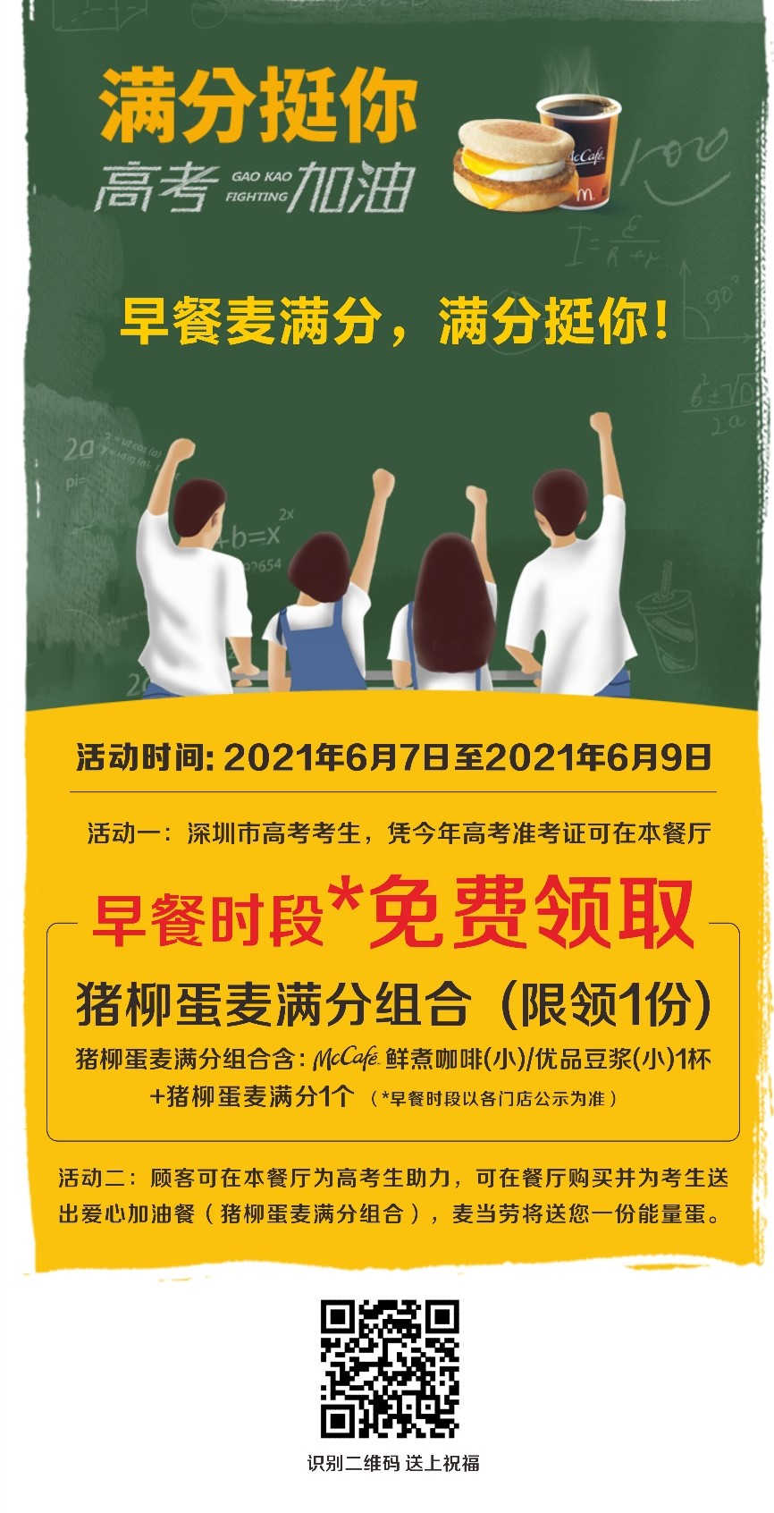 6月3日,深圳麥當勞繼續開展線上線下“滿分挺你”系列活動,為高考考生送出滿分祝福。6月7日-6月9日活動期間,在深圳市售賣早餐的麥當勞餐廳將全天供應雙層豬柳蛋麥滿分,今年參加高考的考生可憑准考證在早餐時間段免費領取豬柳蛋麥滿分組合一份。不僅如此,深圳麥當勞還同步推出“高考加油”線上活動,邀請廣大網友為考生加油助力。